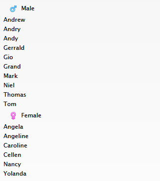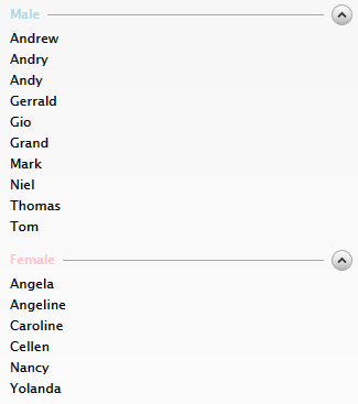 <Intersoft:UXPage.Resources> <StyleSelectors:GenderStyleSelector x:Name="GenderStyleSelector"> <StyleSelectors:GenderStyleSelector.FemaleStyle> <Style TargetType="Intersoft:UXGroupItem"> <Setter Property="Template"> <Setter.Value> <ControlTemplate TargetType="Intersoft:UXGroupItem"> <Grid x:Name="RootElement"> <Intersoft:ExpandableGroupBox HeaderForeground="Pink" Header="{TemplateBinding Header}" Visibility="{TemplateBinding HeaderVisibility}"> <ItemsPresenter/> </Intersoft:ExpandableGroupBox> </Grid> </ControlTemplate> </Setter.Value> </Setter> </Style> </StyleSelectors:GenderStyleSelector.FemaleStyle> <StyleSelectors:GenderStyleSelector.MaleStyle> <Style TargetType="Intersoft:UXGroupItem"> <Setter Property="Template"> <Setter.Value> <ControlTemplate TargetType="Intersoft:UXGroupItem"> <Grid x:Name="RootElement"> <Intersoft:ExpandableGroupBox HeaderForeground="LightBlue" Header="{TemplateBinding Header}" Visibility="{TemplateBinding HeaderVisibility}"> <ItemsPresenter/> </Intersoft:ExpandableGroupBox> </Grid> </ControlTemplate> </Setter.Value> </Setter> </Style> </StyleSelectors:GenderStyleSelector.MaleStyle> </StyleSelectors:GenderStyleSelector> </Intersoft:UXPage.Resources> <Intersoft:UXItemsControl ItemsSource="{Binding Items}" DisplayMemberPath="Name"> <Intersoft:UXItemsControl.GroupStyle> <Intersoft:GroupStyle ContainerStyleSelector="{StaticResource GenderStyleSelector}"/> </Intersoft:UXItemsControl.GroupStyle> </Intersoft:UXItemsControl> |