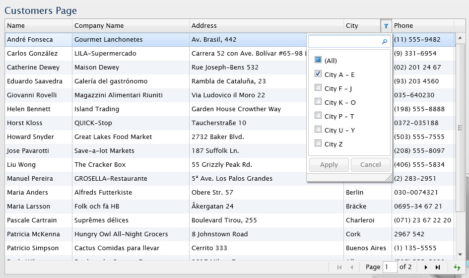 <Intersoft:UXPage... xmlns:ViewModels="clr-namespace:ClientSideGridViewPagingSortingFiltering.ViewModels" > <Intersoft:UXPage.Resources> <ViewModels:CustomersViewModel x:Key="CustomersViewModel"/> </Intersoft:UXPage.Resources> <Grid x:Name="LayoutRoot" DataContext="{StaticResource CustomersViewModel}"> ... <Intersoft:DockPanel... > ... <Grid... > <Intersoft:UXGridView ItemsSource="{Binding Customers}" CanUserPage="True" PageSize="20" AutoGenerateColumns="False" QueryOperation="Client" > <Intersoft:UXGridView.Columns> <Intersoft:UXGridViewTextColumn Header="Name" Binding="{Binding ContactName}" /> <Intersoft:UXGridViewTextColumn Header="Company Name" Binding="{Binding CompanyName}" /> <Intersoft:UXGridViewTextColumn Header="Address" Binding="{Binding Address}" /> <Intersoft:UXGridViewTextColumn Header="City" Binding="{Binding City}"> <Intersoft:UXGridViewTextColumn.FilterItems> <Intersoft:UXDataFilterItem Content="City A - E"> <Intersoft:UXDataFilterItem.Filter> <Intersoft:CompositeFilterDescription LogicalOperator="Or"> <Intersoft:FilterDescription PropertyName="City" Operator="StartsWith" Value="A" /> <Intersoft:FilterDescription PropertyName="City" Operator="StartsWith" Value="B"/> <Intersoft:FilterDescription PropertyName="City" Operator="StartsWith" Value="C"/> <Intersoft:FilterDescription PropertyName="City" Operator="StartsWith" Value="D"/> <Intersoft:FilterDescription PropertyName="City" Operator="StartsWith" Value="E"/> </Intersoft:CompositeFilterDescription> </Intersoft:UXDataFilterItem.Filter> </Intersoft:UXDataFilterItem> <Intersoft:UXDataFilterItem Content="City F - J"> <Intersoft:UXDataFilterItem.Filter> <Intersoft:CompositeFilterDescription LogicalOperator="Or"> <Intersoft:FilterDescription PropertyName="City" Operator="StartsWith" Value="F"/> <Intersoft:FilterDescription PropertyName="City" Operator="StartsWith" Value="G"/> <Intersoft:FilterDescription PropertyName="City" Operator="StartsWith" Value="H"/> <Intersoft:FilterDescription PropertyName="City" Operator="StartsWith" Value="I"/> <Intersoft:FilterDescription PropertyName="City" Operator="StartsWith" Value="J"/> </Intersoft:CompositeFilterDescription> </Intersoft:UXDataFilterItem.Filter> </Intersoft:UXDataFilterItem> <Intersoft:UXDataFilterItem Content="City K - O"> <Intersoft:UXDataFilterItem.Filter> <Intersoft:CompositeFilterDescription LogicalOperator="Or"> <Intersoft:FilterDescription PropertyName="City" Operator="StartsWith" Value="K"/> <Intersoft:FilterDescription PropertyName="City" Operator="StartsWith" Value="L"/> <Intersoft:FilterDescription PropertyName="City" Operator="StartsWith" Value="M"/> <Intersoft:FilterDescription PropertyName="City" Operator="StartsWith" Value="N"/> <Intersoft:FilterDescription PropertyName="City" Operator="StartsWith" Value="O"/> </Intersoft:CompositeFilterDescription> </Intersoft:UXDataFilterItem.Filter> </Intersoft:UXDataFilterItem> <Intersoft:UXDataFilterItem Content="City P - T"> <Intersoft:UXDataFilterItem.Filter> <Intersoft:CompositeFilterDescription LogicalOperator="Or"> <Intersoft:FilterDescription PropertyName="City" Operator="StartsWith" Value="P"/> <Intersoft:FilterDescription PropertyName="City" Operator="StartsWith" Value="Q"/> <Intersoft:FilterDescription PropertyName="City" Operator="StartsWith" Value="R"/> <Intersoft:FilterDescription PropertyName="City" Operator="StartsWith" Value="S"/> <Intersoft:FilterDescription PropertyName="City" Operator="StartsWith" Value="T"/> </Intersoft:CompositeFilterDescription> </Intersoft:UXDataFilterItem.Filter> </Intersoft:UXDataFilterItem> <Intersoft:UXDataFilterItem Content="City U - Y"> <Intersoft:UXDataFilterItem.Filter> <Intersoft:CompositeFilterDescription LogicalOperator="Or"> <Intersoft:FilterDescription PropertyName="City" Operator="StartsWith" Value="U"/> <Intersoft:FilterDescription PropertyName="City" Operator="StartsWith" Value="V"/> <Intersoft:FilterDescription PropertyName="City" Operator="StartsWith" Value="W"/> <Intersoft:FilterDescription PropertyName="City" Operator="StartsWith" Value="X"/> <Intersoft:FilterDescription PropertyName="City" Operator="StartsWith" Value="Y"/> </Intersoft:CompositeFilterDescription> </Intersoft:UXDataFilterItem.Filter> </Intersoft:UXDataFilterItem> <Intersoft:UXDataFilterItem Content="City Z"> <Intersoft:UXDataFilterItem.Filter> <Intersoft:CompositeFilterDescription LogicalOperator="Or"> <Intersoft:FilterDescription PropertyName="City" Operator="StartsWith" Value="Z"/> </Intersoft:CompositeFilterDescription> </Intersoft:UXDataFilterItem.Filter> </Intersoft:UXDataFilterItem> </Intersoft:UXGridViewTextColumn.FilterItems> </Intersoft:UXGridViewTextColumn> <Intersoft:UXGridViewTextColumn Header="Phone" Binding="{Binding Phone}" /> </Intersoft:UXGridView.Columns> </Intersoft:UXGridView> </Grid> </Intersoft:DockPanel> </Grid> </Intersoft:UXPage> |