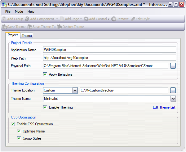 The Project tab represents a single project XML file (*.xml) or a deployed project file (istheme.config) which is used to configure Intersoft WebUI.NET components look and feel throughout the entire Web application.