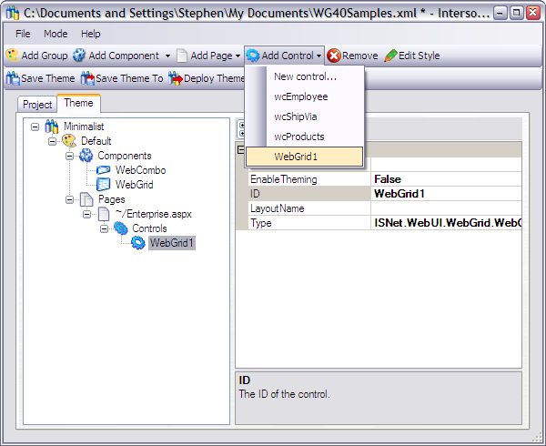 This node contains controls that you want to apply styles on. To add a control, simply select a control from the Add Control dropdown. The Add Control dropdown lists all Intersoft WebUI.NET controls on the selected page. The control would not be listed in the dropdown if you do not have the component of that control type installed.