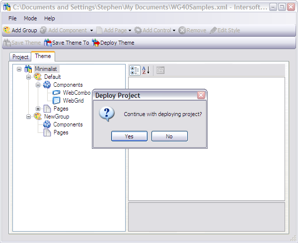 Deploying a theme is a very simple task. All we need to do is clicking on the Deploy Theme button and then confirm the deployment when a dialog box is shown. What happens after you click the deploy button is the WebStyleManager copies the project file to the Web application physical path and change its name to "istheme.config".