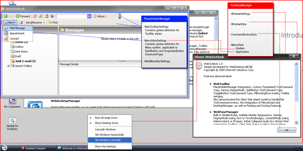 | The red markup represents a DesktopManager instance. As illustrated in above image, the atomic components such as DialogBox (see "About WebOutlook"), Button, ContextMenu and entire Menu system are applying the styles defined at DesktopManager automatically at runtime. | |