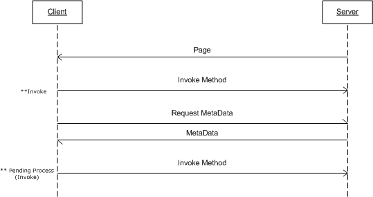 WebFlyPostBackManager will not retrieve the MetaDataCollection at PageLoad. During the first execution of InvokeMethod, WebFlyPostBackManager will check whether the MetaDataCollection already existed. If the MetaDataCollection does not exist, it will request MetaDataCollection first. When collecting the MetaDataCollection, the InvokeMethod request is pending, until the MetaDataCollection is retrieved |