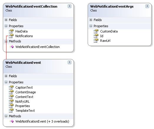 The WebNotificationEvent object is the central notification data that contains information about an event. As seen in above diagram, the object contains information such as the CaptionText, NotifyURL and so on; which provided by the developers. The information provided in the object will be automatically retrieved by the WebNotification control in the client side for the end user notification display process.