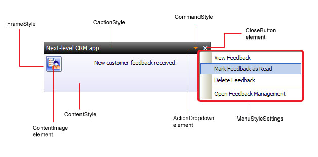 With this flexibility, WebNotification component is not only powerful in the term of architecture and object model, it also offers fully customizable styles for most of the elements as described in above diagram.