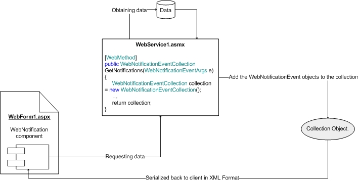 As illustrated in above diagram, WebNotification control begins its life cycle by requesting data from WebService. The GetNotifications function will then execute the contained codes and add new WebNotificationEvent object to the collection when data existed. Finally, the collection is returned from the function. The collection object will then serialized back to the client as XML data and processed internally by the WebNotification control.