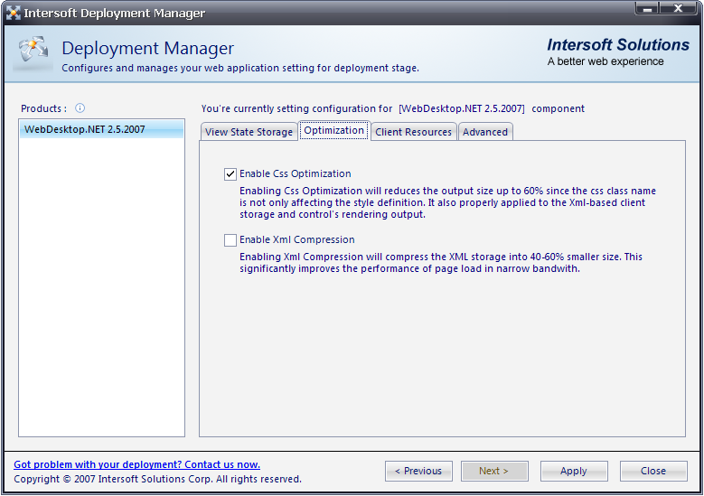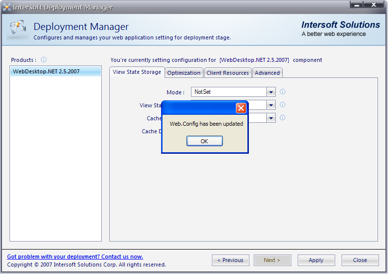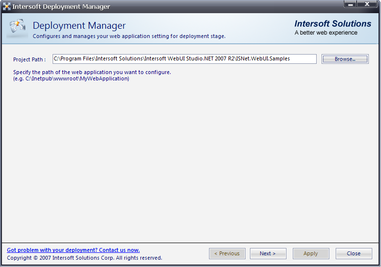 - Open Deployment Manager from Start menu >> All Programs >> Intersoft WebUI Studio.NET 2007 R2 >> WebUI.NET Framework 3.0 >> Deployment Manager.