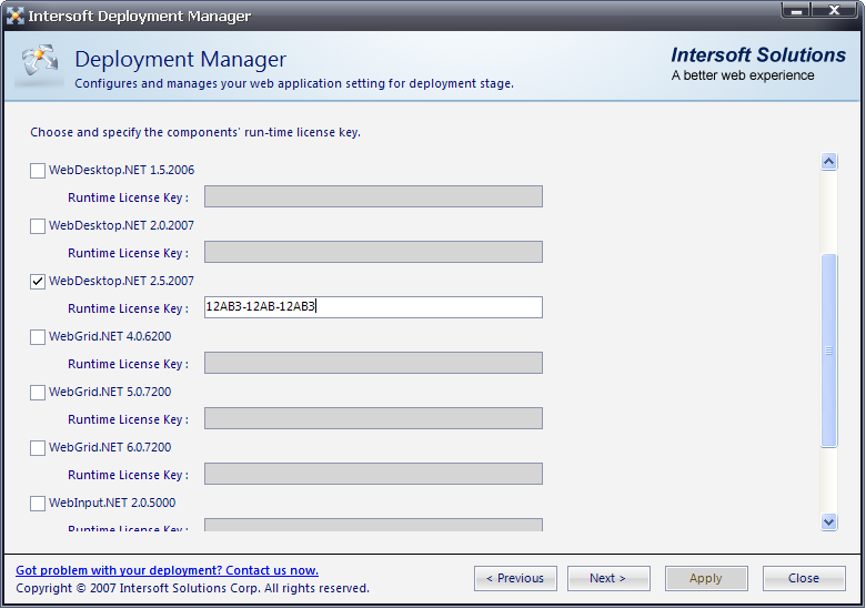 - Tick WebDesktop.NET 2.5.2007 and put the Runtime License key according to the component. Click Next to proceed to the next step.