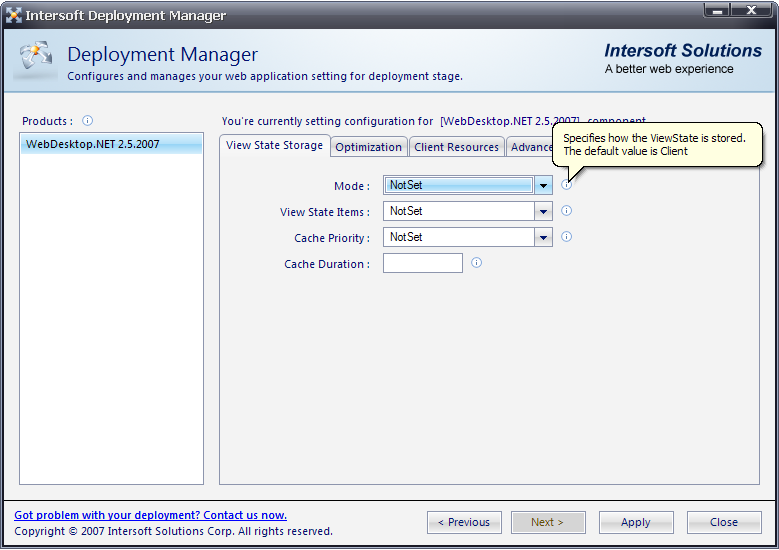 View State Storage section lets you configure how ViewState is stored, specify how ViewState items are going to be saved in ViewState and determine the priority and duration of items stored in Cache object.