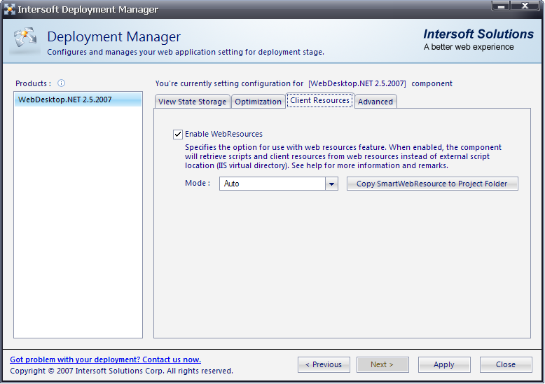 If you have applied SmartWebResources™ in your project, this option will be automatically selected with its default mode set to Auto.