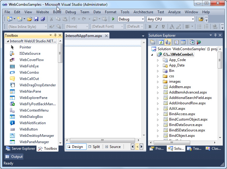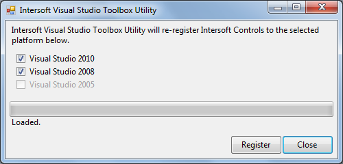 - Run Intersoft ToolBox Utility for Visual Studio from Start Menu >> All Programs >> Intersoft WebUI Studio 2010 R1 >> Intersoft ToolBox Utility for Visual Studio or you can access ToolBoxUtility.exe from [Installation Folder]\Intersoft Solutions\Intersoft WebUI Studio 2010 R1\ToolBoxUtility