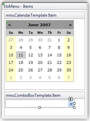 To use Template, set the Type of the menu item to Template. Next, in the Visual Studio 2005 designer, right click on the control instance and choose Edit Templates > Items. Finally you will see the region's surface where you can perform editing. See the following screenshot for more details. |