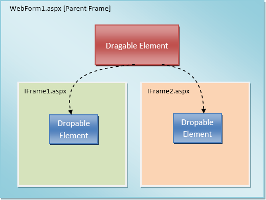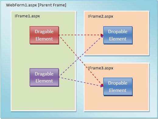 In the illustration above, the WebForm1.aspx contains three floating IFRAMEs. The left one is IFrame1.aspx, and two in the right side are IFrame2.aspx and IFrame3.aspx. The first IFRAME includes two dragable elements, which can be dropped to target element in either second or third IFRAME.