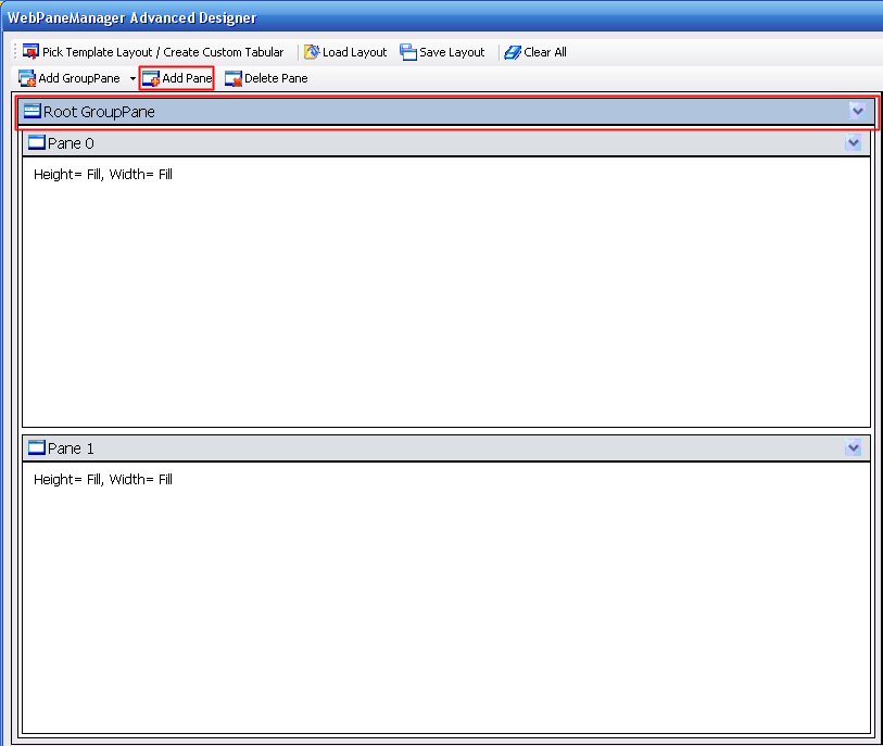 The Add Pane toolstrip menu is used to add pane to the currently selected GroupPane. You can add as many pane as you like to the currently selected GroupPane using this command.Since the items in ToolStripActions is dynamically visible depending on the currently selected object in the Designer, this toolStrip menu is only visible when a GroupPane is selected.