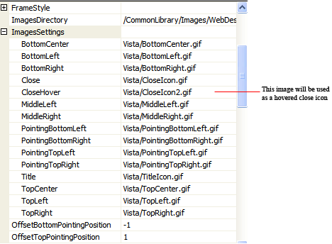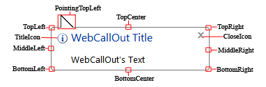 With this feature, you can build your own design for WebCallOut. The ComplexImages allows you to specify the images needed by WebCallOut to render the component. In order to create your own design for WebCallOut, 15 images are needed. You can specify the images in ImagesSettings. Some of the design probably requires the pointing position images to be placed higher or lower in the WebCallOut's form. You can specify the suitable position for the pointing position images by set OffsetBottomPointingPosition and OffsetTopPointingPosition.