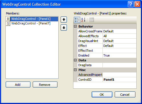 - On DragControls property, click the (collection) to open WebDragControl Collection Editor. Set which panels that will become DragControl.