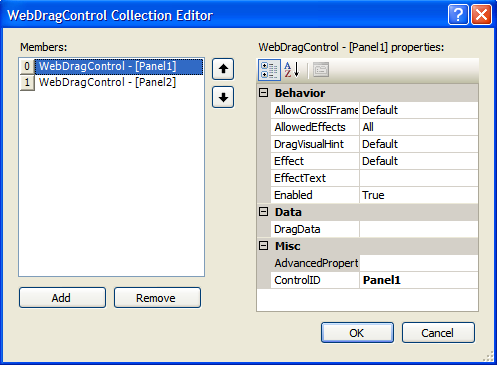 - On DragControls property, click the (collection) to open WebDragControl Collection Editor. Set Panel1 and Panel2 as DragControl.