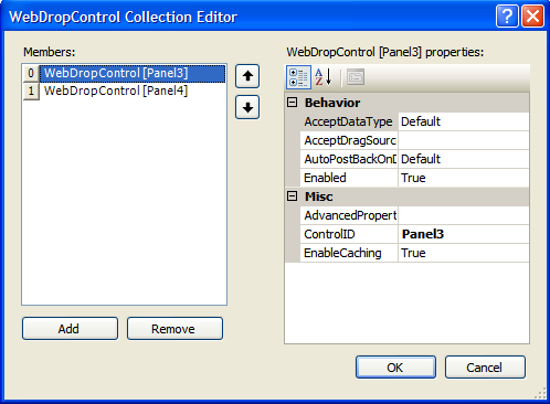 - On DropControls property, click the (collection) to open WebDropControl Collection Editor. Set Panel3 and Panel4 as DropControl.
