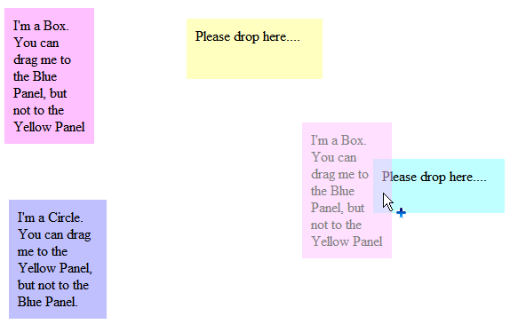 - Run the project. You will notice the cursor effect when trying to drag the drag able panel and drop it to the drop able panel.