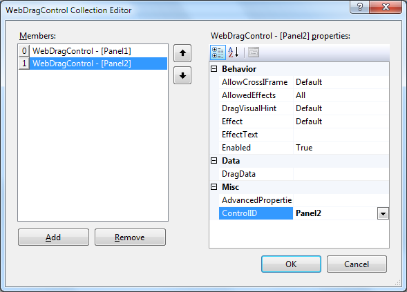 - On DragControls property, click the (collection) button to open WebDragControl Collection Editor. You can set which panel will be the DragControl.