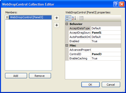 - On DropControls property, click the (collection) button to open WebDropControl Collection Editor. You can set which panel will be the DropControl and set AcceptDragSourceControls to Panel1.