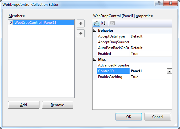 - On DropControls property, click the (collection) button to open WebDropControl Collection Editor. You can set which panel that will be the DropControl.