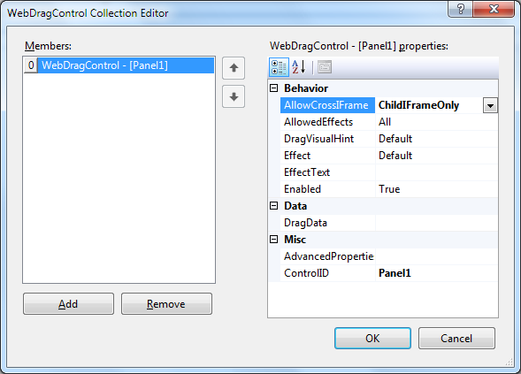 - On DragControls property, click the (collection) button to open WebDragControl Collection Editor. You can set which panel that will be the DragControl and AllowCrossIFrame property to ChildIFrameOnly.