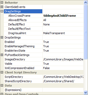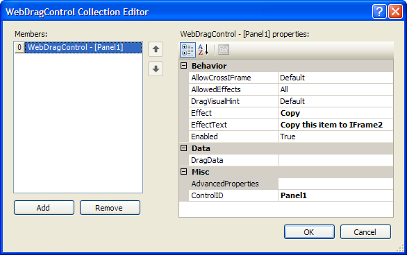 - On DragControls property, click the (collection) button to open WebDragControl Collection Editor. You can set which panel that will be the DragControl also set for the Effect and EffectText.