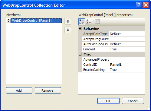 - On DropControls property, click the (collection) button to open WebDropControl Collection Editor. You can set which panel that will be the DropControl.