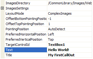 Properties Value Text Hello World! Title My First WebCallOut TargetControlID <TextBox Id>. For Example: TextBox1