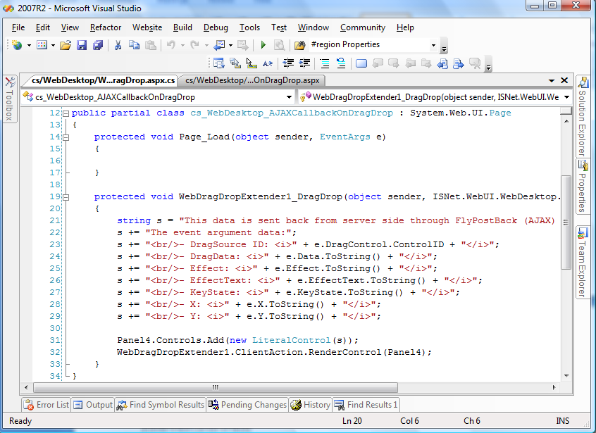 protected void WebDragDropExtender1_DragDrop(object sender, ISNet.WebUI.WebDesktop.WebDragDropEventArgs e) { string s = "This data is sent back from server side through FlyPostBack (AJAX) call.<br/><br/>";
