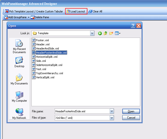 When the LoadLayout button in toolStrip Menu is clicked, an OpenFileDialog will appear. From there you can select the xml file which contains the WebPane object information. The designer will DeSerialize the XML to a Pane Object.