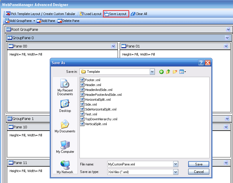 When the SaveLayout button in toolStrip Menu is clicked, an SaveFileDialog will appear. From there you can type the xml file name you wish to save or replace and existing one. The actual object in the stage will then be serialized in the form of XML file.
