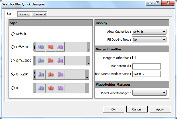 - Right click on WebToolBar control and choose WebToolBar Quick Designer. The WebToolBar Quick Designer dialog box will be displayed. In the Bar tab, choose OfficeXP as the Style. Press Apply and then OK.