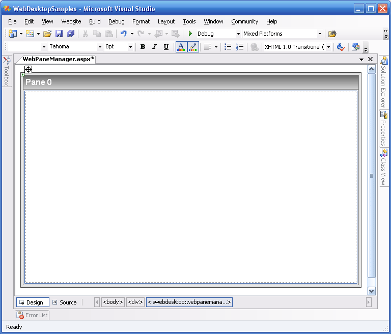 - Drag the WebPaneManager component from the Toolbox into the WebForm.