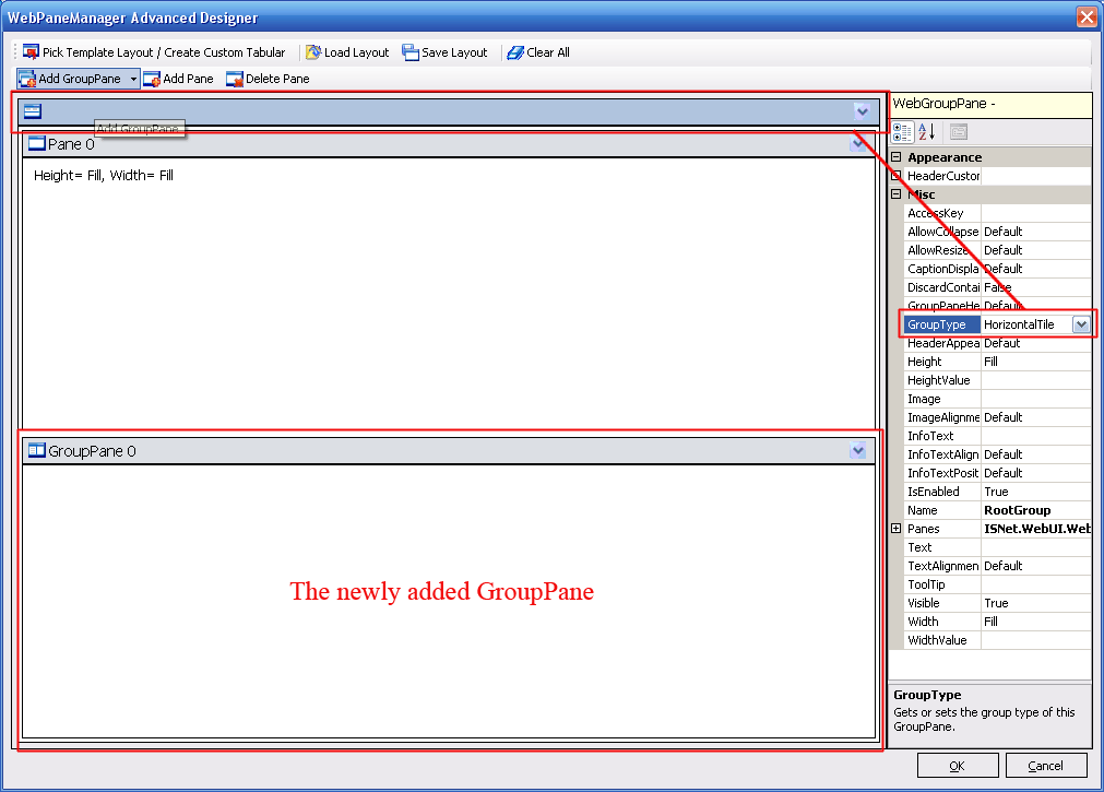 - Set the GroupContent GroupType property to Vertical, then add 2 Panes to the GroupContent. Named the first pane
