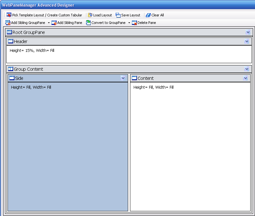 To create a simple layout such as HeaderSide Layout, you can use our WebPaneManager Advanced Designer to aid you in doing it conveniently.