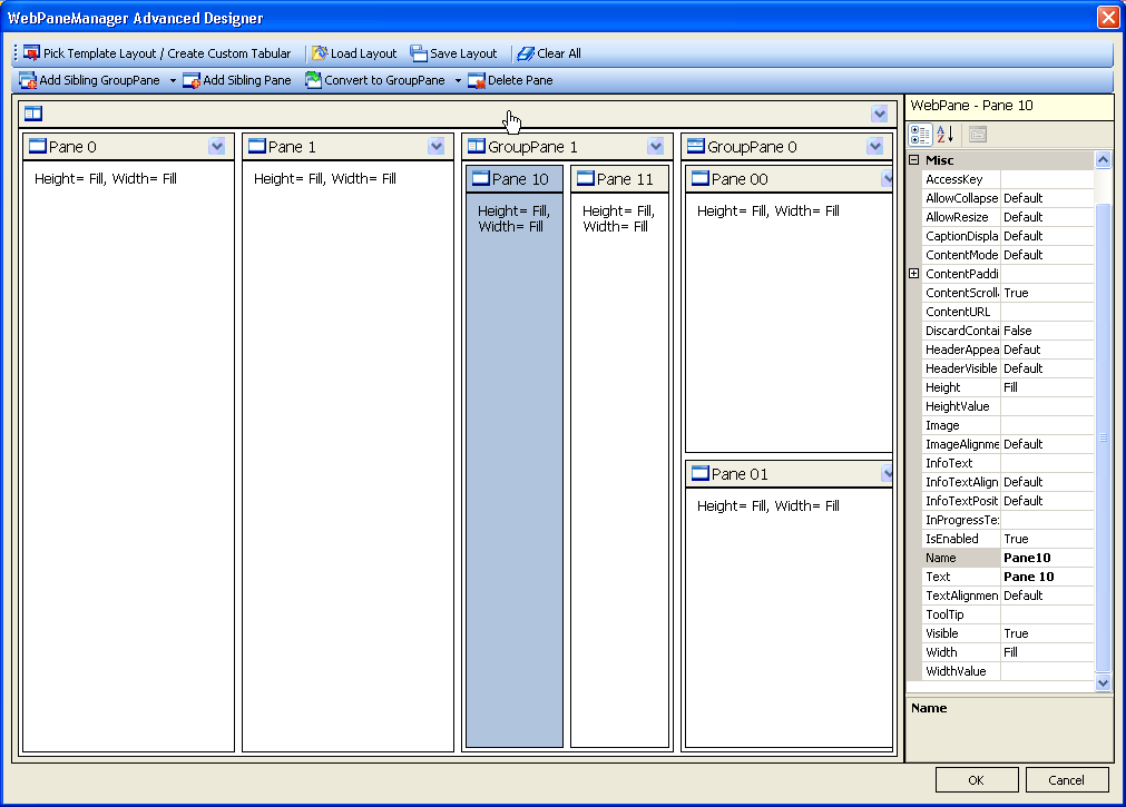 Use the toolbars on WebPaneManager Advanced Designer to create the layout. You can choose to add either GroupPane or a normal pane.