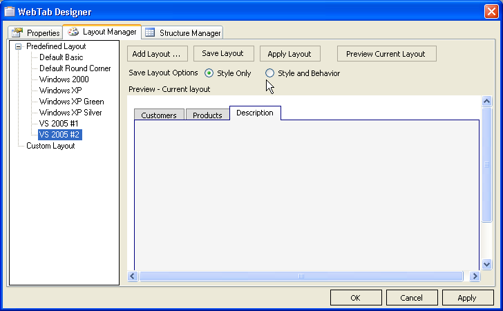 - Right Click on the WebTab's instance, click on WebTab Designer, choose "Layout Manager". Expand the "Predefined Layout" node, and choose "Visual Studio