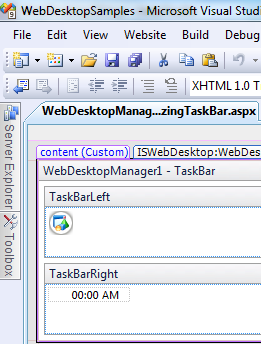 The WebDesktopManager provides flexibility to the TaskBar by allowing developers to add more sophisticated contents and functions to the TaskBar area. You can add your own contents in the TaskBar element by using the provided TaskBarLeft and TaskBarRight Template.