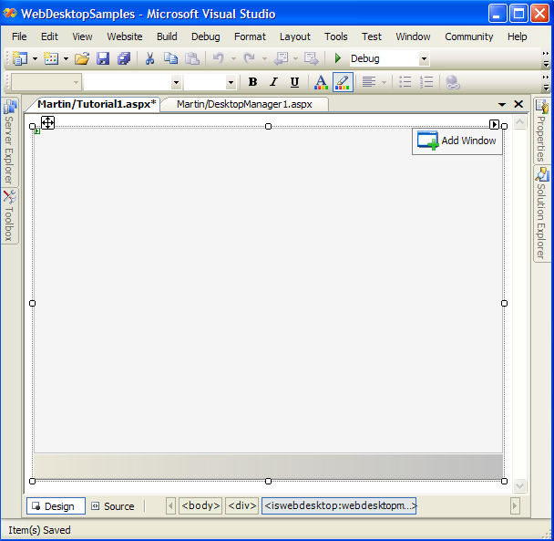- Create a DesktopManager instance by dragging a WebDesktopManager component from ToolBox to the Design Surface.