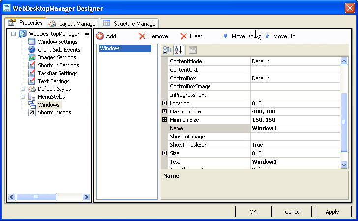 - Click on the Properties - Windows and select "Window1" or any other windows that you want to set the