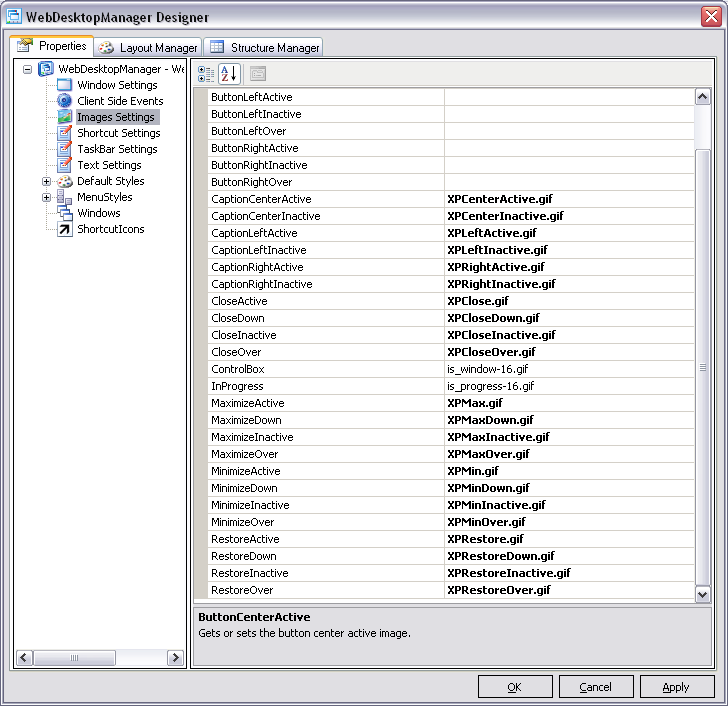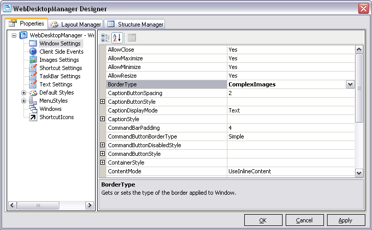 - In WebDesktopManager Designer, choose Window Settings, and set the BorderType property to ComplexImages.
