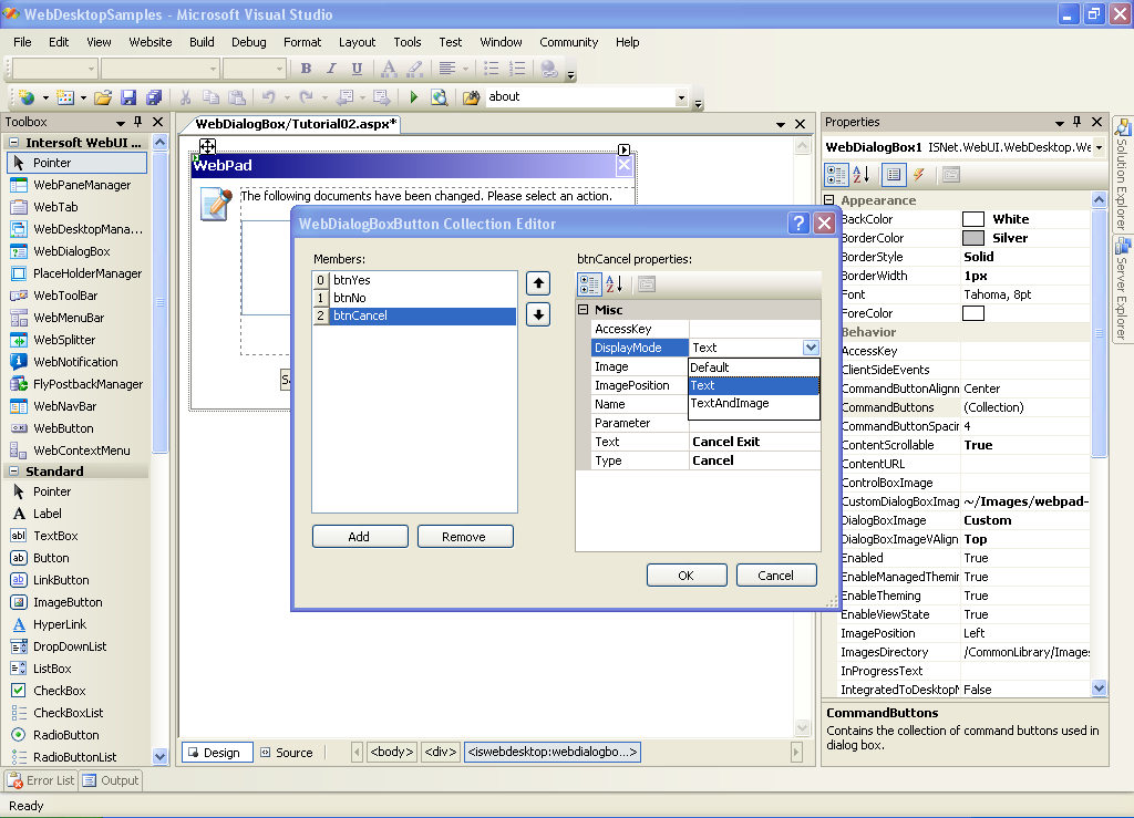 Alternatively, to change the display of the WebDialogBox's Button, we can specify it using DisplayMode Property.