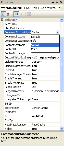 To specify WebDialogBox's Buttons' Alignment, change the value of CommandButtonAlignment property.