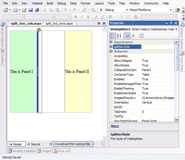 Drag and drop the WebSplitter from the toolbox control onto the cell that you have just created, and customize the style as you like, illustrated in the below image: