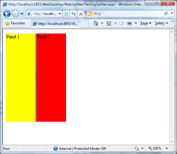 <table style="table-layout: fixed; height: 300px; border-collapse: collapse;"> <tr> <td style="background-color: Yellow; width: 100px;"> Panel 1 </td> <td style="width: 100px"> <ISWebDesktop:WebSplitter ID="WebSplitter1" runat="server" GripImageCollapse="../Images/dot_v.gif" GripImageRestore="../Images/dot_v.gif"> <SplitterStyle> <Active BaseStyle="Normal" BackColor="Black"> </Active> <Normal Overflow="Hidden" OverflowY="Hidden" OverflowX="Hidden" BackColor="Gray"> </Normal> <Over BaseStyle="Normal"> </Over> </SplitterStyle> </ISWebDesktop:WebSplitter> </td> <td style="background-color: Red; width: 100px;"> Panel 2 </td> </tr> - Set Orientation to Vertical and AllowCollapse to True. You can also set Orientation to Horizontal when you want to split rows using splitter.