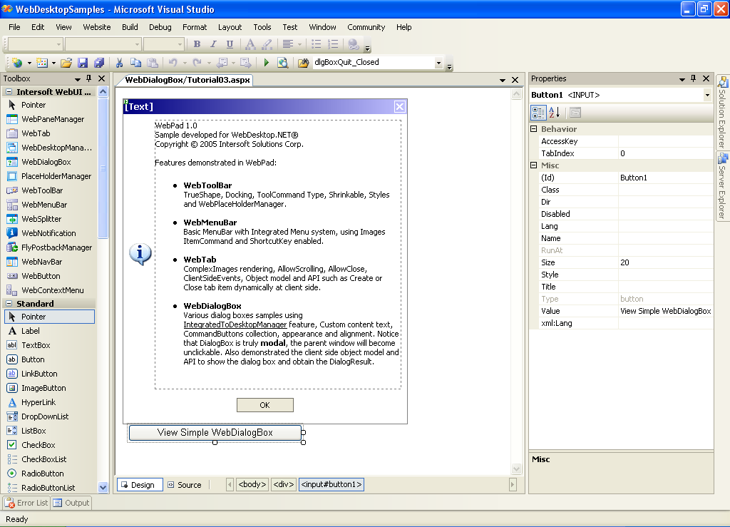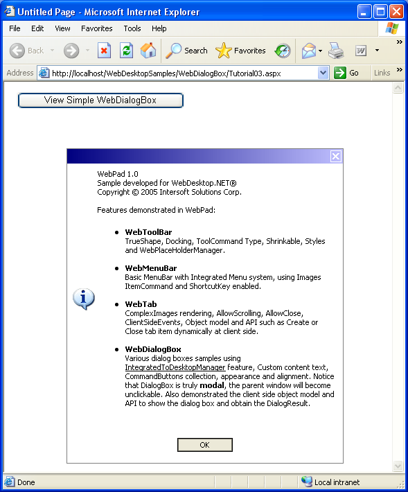 - See Creating Simple DialogBox to create a simple WebDialogBox.