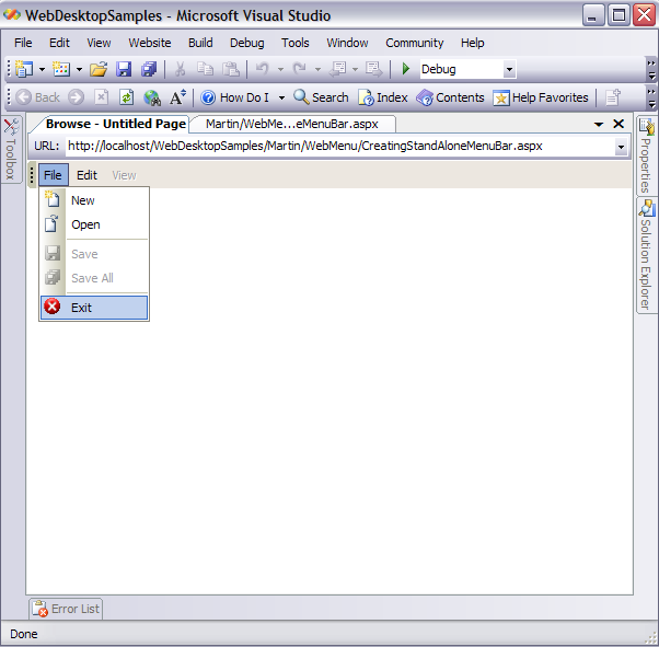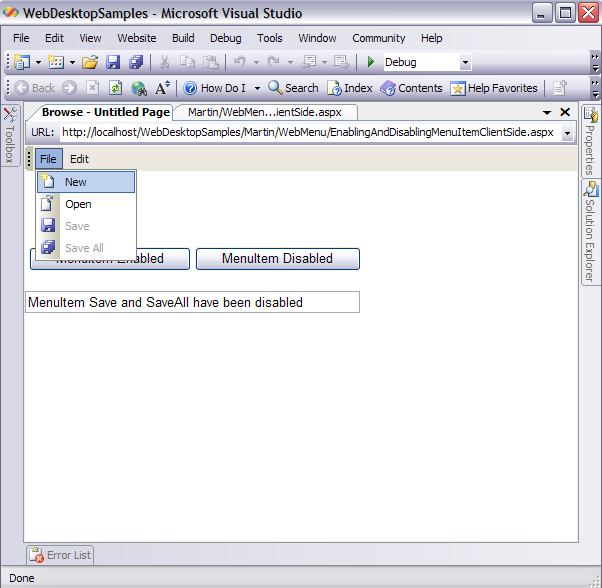 - Click the "MenuItem Enabled" HTML Button. You will notice that the HTML Text will display its value and when you click on the File Menu,