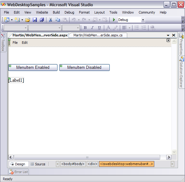 - Drag WebMenu, Server Buttons, and Label from Toolbox into a WebForm page. Named the Server Buttons "MenuItem Enabled" and "MenuItem